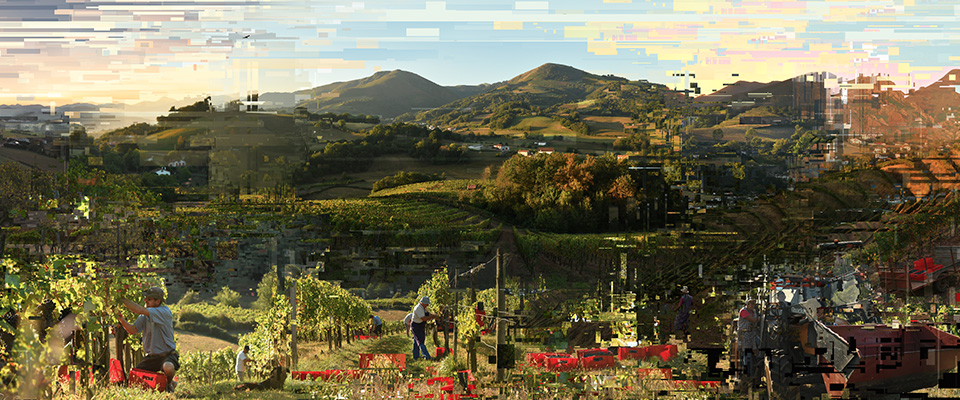 WINE PIXEL, création inédite pour l’ISVV, regroupe à la fois 39 photos de différents formats et 5 œuvres d’art contemporain XXL illustrant les différents paysages vitivinicoles de Nouvelle-Aquitaine et les différents cycles du travail de la vigne au chai.